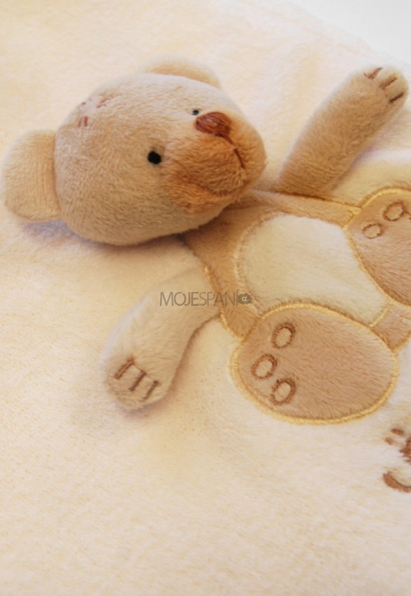 Vzdušná dětská deka s trojrozměrnou aplikací, která aktivuje vývoj dítěte. Deka v pastelových barvách. Ideální do kočárku i dětské postýlky. Možno použít jeko lehkou přikrývku i jako hrací deku pro hraní na podlaze. 3D aplikace - medvídek.