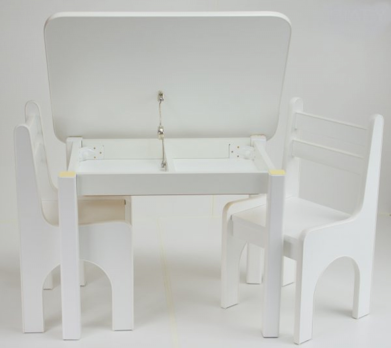 Sada obsahuje stůl a dvě židle. Stolek má otevírací desku. Díky nim so mohou děti užívat spoustu legrace a radosti, že mohou skrýt své poklady. A Vy máte méně věcí na úklid :). Barvičky, sešity nebo omalovánky lze snadno umístit do stolu. Na druhé straně jsou židle skvělým úkrytem pro tužky, pera nebo jiné menší hračky.