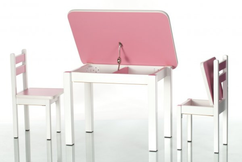 Sada obsahuje stůl a dvě židle. Obě vysoké židle a stolek mají otevírací desky. Díky nim so mohou děti užívat spoustu legrace a radosti, že mohou skrýt své poklady. A Vy máte méně věcí na úklid :). Barvičky, sešity nebo omalovánky lze snadno umístit do stolu. Na druhé straně jsou židle skvělým úkrytem pro tužky, pera nebo jiné menší hračky.