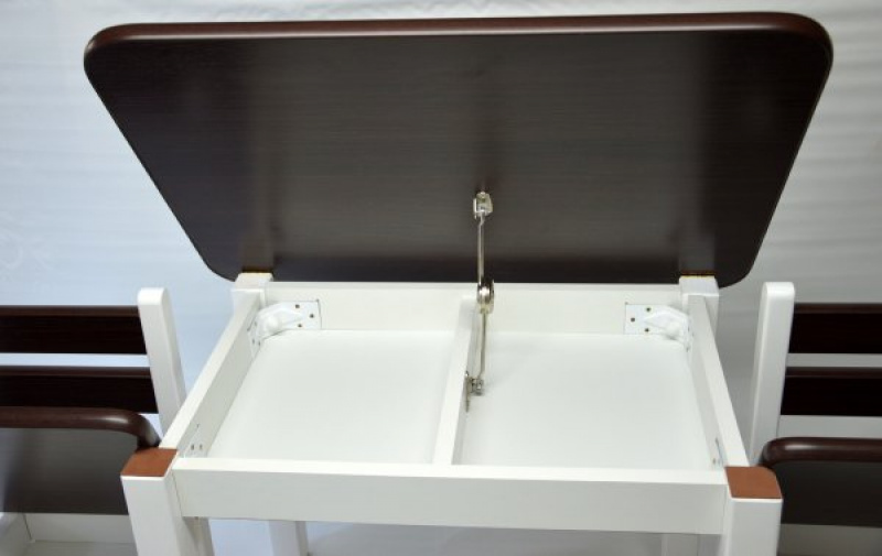 Deska stolu je zvedána pomocí mechanického zdvihu s nastavitelnou tlakovou silou, kterou lze přizpůsobit věku a síle dítěte. Nábytek je určen pro děti od 1,5 do 6 let. Desky stolu a židle jsou vyrobeny z laminované nábytkové desky, takže je velmi snadné udržet je v čistotě (stačí otřít vlhkým hadříkem). Nohy židlí a stolu jsou z olše. Dvakrát natřený nezávadným lakem. Všechny barvy mají požadované certifikáty a jsou zcela bezpečné pro děti. Jedná se o speciální barvy na nátěr nábytku a dětských hraček. Tento jedinečný komplet, bude sloužit Vašim dětem k jídlu, kreslení, hraní atd. Díky skladovacím prostorům budou mít Vaše děti své tajné úložiště