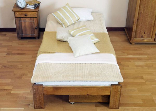 Nová postel z masivu borovice o síle 26 mm. Postele jsou lakovány dvakrát bezbarvým ekologicky a zdravotně nezávadným lakem. Lůžka jsou ručně barvená, broušená a znovu lakovaná, pouze tento postup zaručí požadovaný konečný výsledek . Postel vypadá dokonale a zachovává si svou původní strukturu. Postele v barevných provedeních olše, dub a ořech, jsou napřed mořeny ve výše zmíněných odstínech a následně dvakrát lakovány průhledným lakem. Barevná provedení naleznete zvlášť.