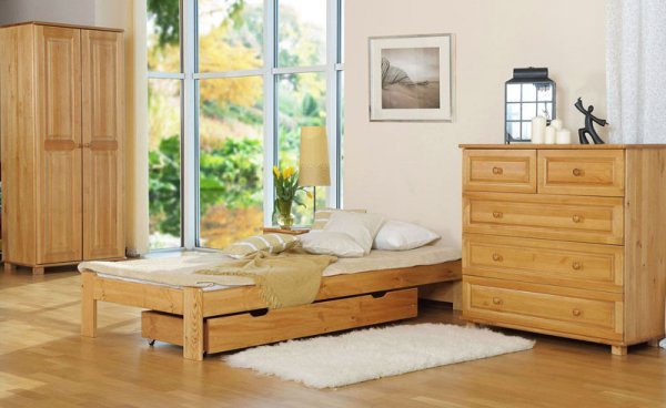 Nová postel z masivu borovice o síle 26 mm. Postele jsou lakovány dvakrát bezbarvým ekologicky a zdravotně nezávadným lakem. Lůžka jsou ručně barvená, broušená a znovu lakovaná, pouze tento postup zaručí požadovaný konečný výsledek . Postel vypadá dokonale a zachovává si svou původní strukturu. Postele v barevných provedeních olše, dub a ořech, jsou napřed mořeny ve výše zmíněných odstínech a následně dvakrát lakovány průhledným lakem. Barevná provedení naleznete zvlášť.