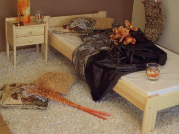 Nová postel z masivu borovice o síle 25 - 28 mm, jejíž součástí je rovněž laťkový rošt. Postele jsou lakovány dvakrát bezbarvým ekologicky a zdravotně nezávadným lakem. Postele v barevných provedeních olše, dub a ořech, jsou napřed mořeny ve výše zmíněných odstínech a následně dvakrát lakovány průhledným lakem. Barevná provedení naleznete zvlášť.