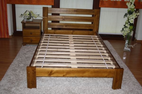 Nová postel z masivu borovice o síle 25 - 28 mm. Postele jsou lakovány dvakrát bezbarvým ekologicky a zdravotně nezávadným lakem. Postele v barevných provedeních olše, dub a ořech, jsou napřed mořeny ve výše zmíněných odstínech a následně dvakrát lakovány průhledným lakem. Barevná provedení naleznete zvlášť.