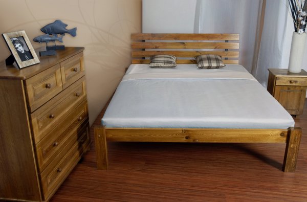 Nová postel z masivu borovice o síle 26 mm. Postele jsou lakovány dvakrát bezbarvým ekologicky a zdravotně nezávadným lakem. Lůžka jsou ručně barvená, broušená a znovu lakovaná, pouze tento postup zaručí požadovaný konečný výsledek . Postel vypadá dokonale a zachovává si svou původní strukturu. Postele v barevných provedeních olše, dub a ořech, jsou napřed mořeny ve výše zmíněných odstínech a následně dvakrát lakovány průhledným lakem. Barevná provedení naleznete zvlášť.