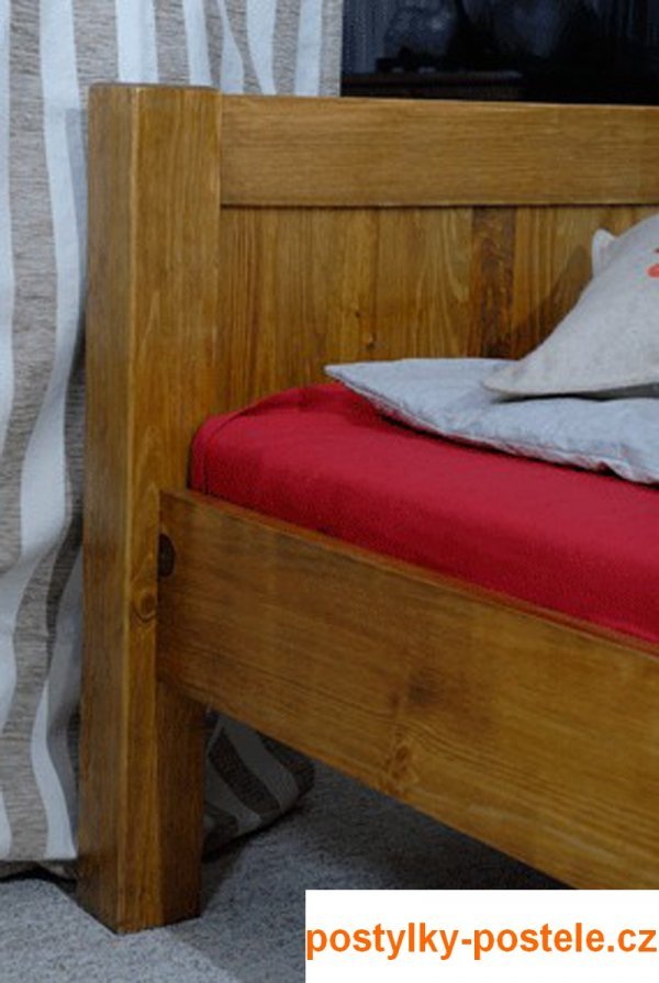 Nová postel z masivu borovice o síle 26 mm. Postele jsou lakovány dvakrát bezbarvým ekologicky a zdravotně nezávadným lakem. Lůžka jsou ručně barvená, broušená a znovu lakovaná, pouze tento postup zaručí požadovaný konečný výsledek . Postel vypadá dokonale a zachovává si svou původní strukturu. Postele v barevných provedeních olše, dub a ořech, jsou napřed mořeny ve výše zmíněných odstínech a následně dvakrát lakovány průhledným lakem. Barevná provedení naleznete zvlášť.