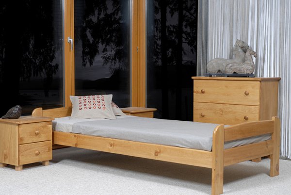 Nová postel z masivu borovice o síle 25 - 28 mm. Postele jsou lakovány dvakrát bezbarvým ekologicky a zdravotně nezávadným lakem. Postele v barevných provedeních olše, dub a ořech, jsou napřed mořeny ve výše zmíněných odstínech a následně dvakrát lakovány průhledným lakem. Barevná provedení naleznete zvlášť.