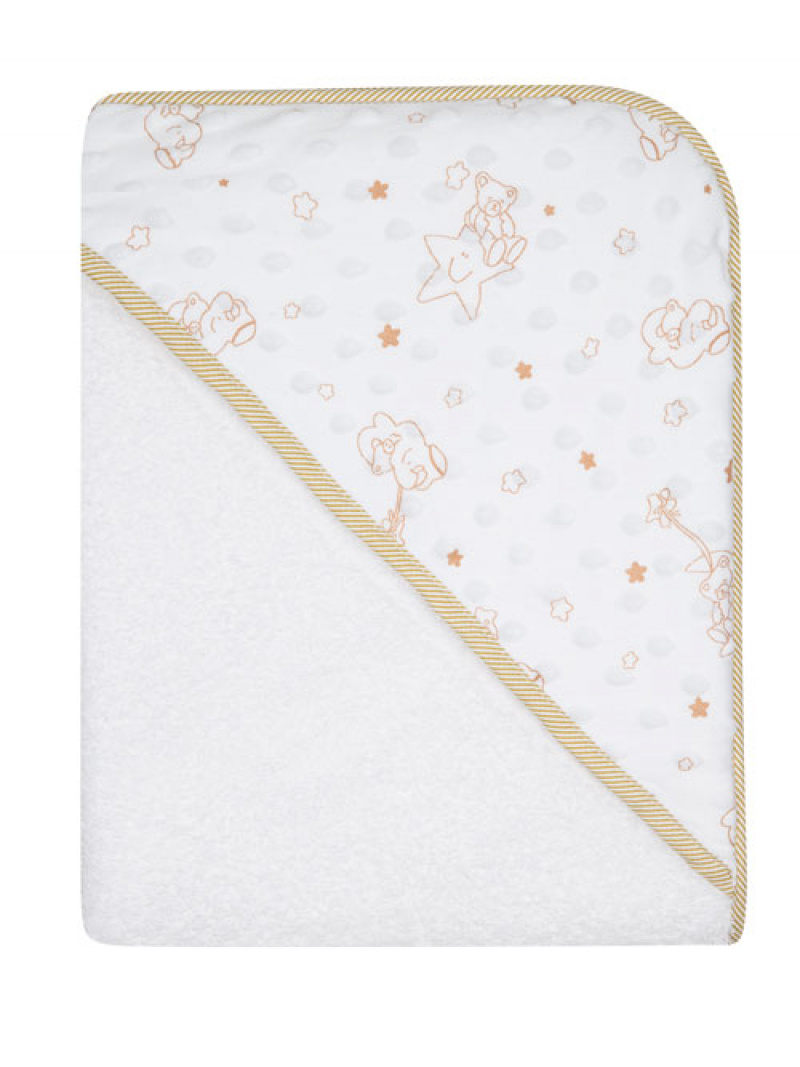 Tkanina na koupání ze 100% bavlněné tkaniny typu minky. Velká velikost 100x100 cm. Dítě chrání před chladem a poskytuje příjemný pocit tepla a pohodlí po koupání. Kapuce na druhé straně umožňuje pokrýt mokrou hlavu dítěte. Velmi měkký a příjemný materiál pro citlivou a jemnou pokožku, nezpůsobuje podráždění.