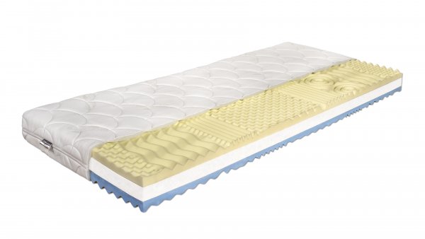 Oblíbená zdravotní sendvičová matrace z vysoce elastické paměťové pěny LAZY-FOAM, 7 zónovou anatomickou profilací v kombinaci s jádrem z tvrzené POE pěny a profilovanou deskou FLEX-PUR. Středové zpevnění jádra pro možné vyšší zatížení. Povrch matrace je tvarován oboustranně do nopů, které zlepšují prokrvení pokožky a uvolňují svalstvo během spánku.
