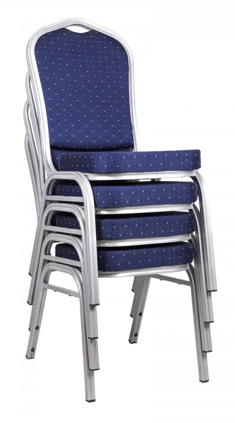 Banketová židle má silnou a stabilní strukturu vyrobenou z rozšířeného ocelového profilu (25 x 25 mm) o tloušťce stěny 1,2 mm. Rám židle je odolný vůči poškrábání díky kovové práškové povrchové úpravě. Sedadlo s tloušťkou 5,5 cm poskytuje pohodlí a pohodlí při sezení a stříbrná barva rámu v kombinaci s čalouněným modrým potahem dává židli elegantní vzhled.