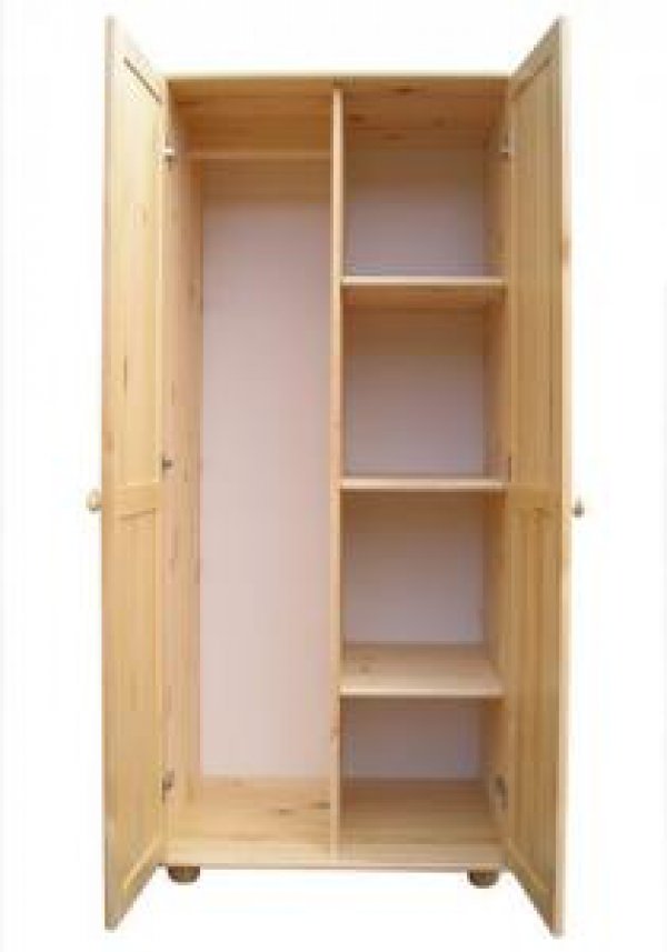 Šatní skříň z masivu. Skříň je vyrobena z borovicového dřeva I. jakosti v odstínu přírodním. Je lakovaná ekologicky nezávadným bezbarvým lakem. Pevná a stabilní. Je vhodná jak do ložnice, tak do předsíně. Šatní skříň je rozdělena na část policovou a část šatní. Tato skříň se hodí k námi nabízeným postelím, nočním stolkům, komodám a všemu borovicovému nábytku.