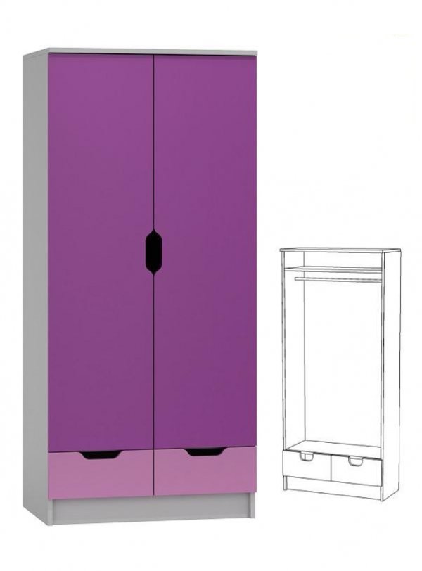 Skříň je vyrobena z 18 mm laminované dřevotřísky. Hrany nábytku jsou zakončeny bezpečností přírubou PVC / ABS, která výrazně chrání před mechanickým poškozením a vlhkostí. Nábytek je vhodný do kombinace s jinými prvky kolekce Violet, jako například komody, skříně, regály atd.