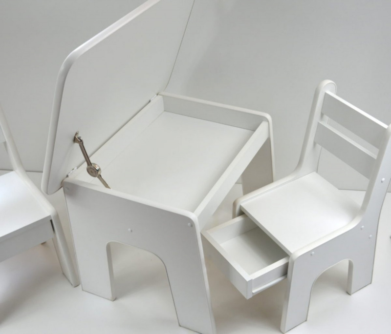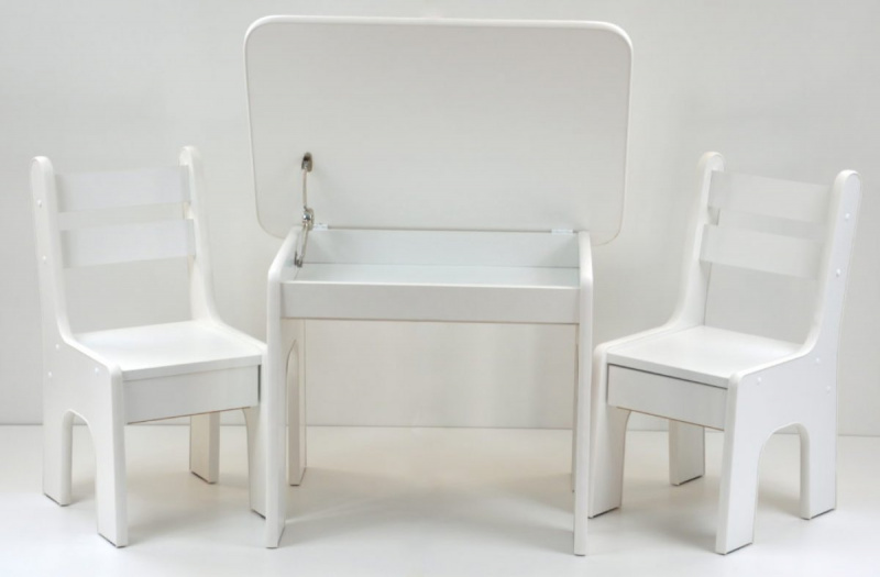 Sada obsahuje stůl a dvě židle. Obě vysoké židle s ukrytými zásuvkami. Stolek má otevírací desku. Díky nim si mohou děti užívat spoustu legrace a radosti, že mohou skrýt své poklady. A Vy máte méně věcí na úklid :). Barvičky, sešity nebo omalovánky lze snadno umístit do stolu. Na druhé straně jsou židle skvělým úkrytem pro tužky, pera nebo jiné menší hračky.