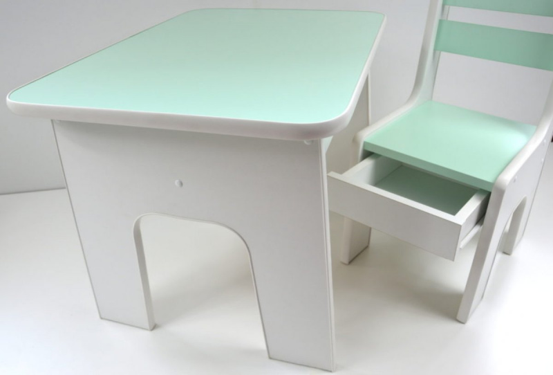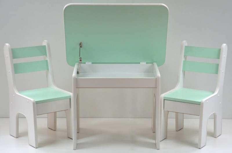 Deska stolu je zvedána pomocí mechanického zdvihu s nastavitelnou tlakovou silou, kterou lze přizpůsobit věku a síle dítěte. Nábytek je určen pro děti od 1,5 do 7 let. Desky stolu a židle jsou vyrobeny z laminované nábytkové desky, takže je velmi snadné udržet je v čistotě (stačí otřít vlhkým hadříkem). Nohy židlí a stolu jsou z olše. Dvakrát natřený nezávadným lakem. Všechny barvy mají požadované certifikáty a jsou zcela bezpečné pro děti. Jedná se o speciální barvy na nátěr nábytku a dětských hraček. Tento jedinečný komplet, bude sloužit Vašim dětem k jídlu, kreslení, hraní atd. Díky skladovacím prostorům budou mít Vaše děti své tajné úložiště