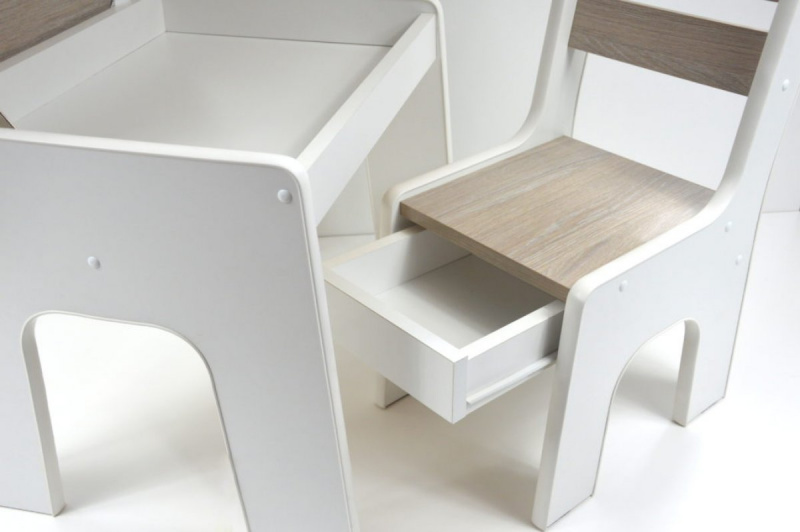 Sada obsahuje stůl a dvě židle. Obě vysoké židle s ukrytými zásuvkami. Stolek má otevírací desku. Díky nim si mohou děti užívat spoustu legrace a radosti, že mohou skrýt své poklady. A Vy máte méně věcí na úklid :). Barvičky, sešity nebo omalovánky lze snadno umístit do stolu. Na druhé straně jsou židle skvělým úkrytem pro tužky, pera nebo jiné menší hračky.