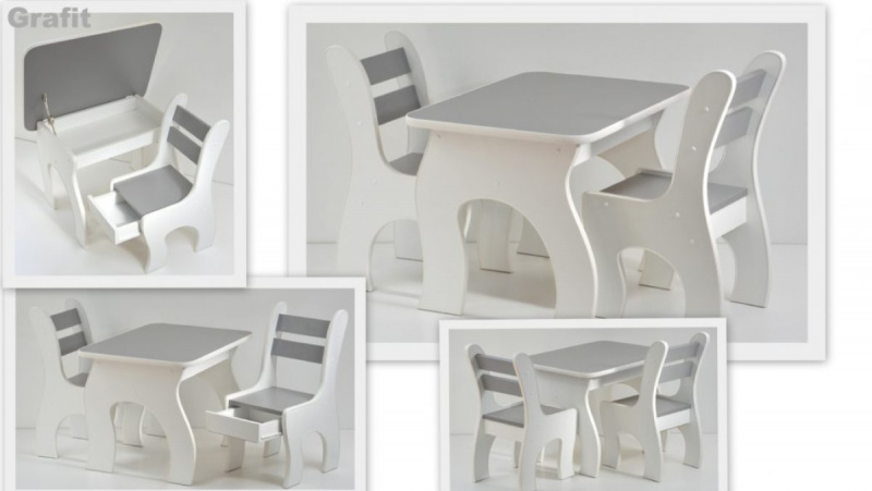 Sada obsahuje stůl a dvě židle. Obě vysoké židle s ukrytými zásuvkami. Stolek má otevírací desku. Díky nim si mohou děti užívat spoustu legrace a radosti, že mohou skrýt své poklady. A Vy máte méně věcí na úklid :). Barvičky, sešity nebo omalovánky lze snadno umístit do stolu. Na druhé straně jsou židle skvělým úkrytem pro tužky, pera nebo jiné menší hračky.
