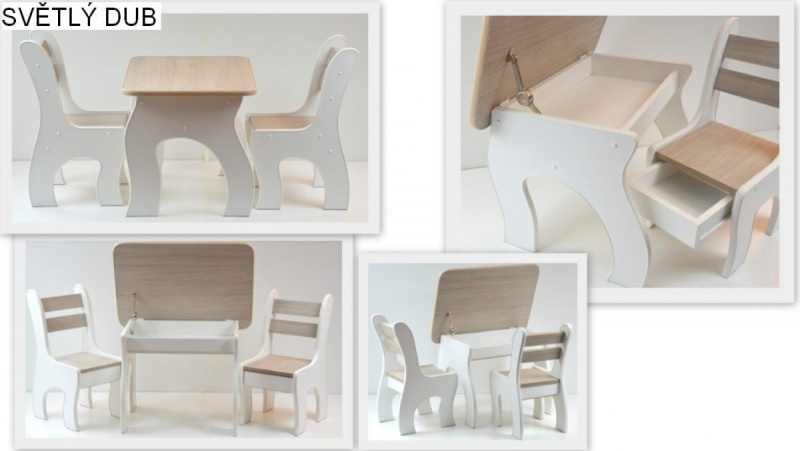 Deska stolu je zvedána pomocí mechanického zdvihu s nastavitelnou tlakovou silou, kterou lze přizpůsobit věku a síle dítěte. Nábytek je určen pro děti od 1,5 do 7 let. Desky stolu a židle jsou vyrobeny z laminované nábytkové desky, takže je velmi snadné udržet je v čistotě (stačí otřít vlhkým hadříkem). Nohy židlí a stolu jsou z olše. Dvakrát natřený nezávadným lakem. Všechny barvy mají požadované certifikáty a jsou zcela bezpečné pro děti. Jedná se o speciální barvy na nátěr nábytku a dětských hraček. Tento jedinečný komplet, bude sloužit Vašim dětem k jídlu, kreslení, hraní atd. Díky skladovacím prostorům budou mít Vaše děti své tajné úložiště