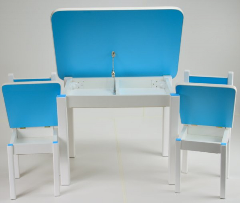 Sada obsahuje stůl a dvě židle. Obě vysoké židle a stolek mají otevírací desky. Díky nim so mohou děti užívat spoustu legrace a radosti, že mohou skrýt své poklady. A Vy máte méně věcí na úklid :). Barvičky, sešity nebo omalovánky lze snadno umístit do stolu. Na druhé straně jsou židle skvělým úkrytem pro tužky, pera nebo jiné menší hračky.