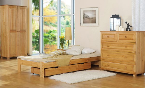 Nová postel z masivu borovice o síle 26 mm. Postele jsou lakovány dvakrát bezbarvým ekologicky a zdravotně nezávadným lakem. Lůžka jsou ručně barvená, broušená a znovu lakovaná, pouze tento postup zaručí požadovaný konečný výsledek . Postel vypadá dokonale a zachovává si svou původní strukturu. Postele v barevných provedeních olše, dub a ořech, jsou napřed mořeny ve výše zmíněných odstínech a následně dvakrát lakovány průhledným lakem.
