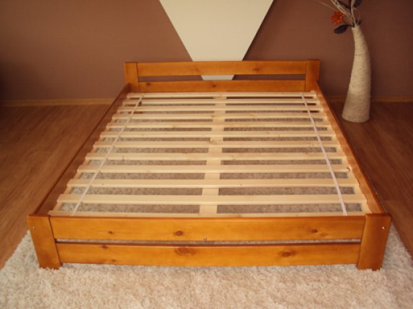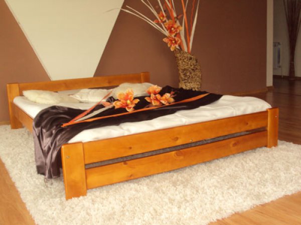 Nová postel z masivu borovice o síle 25 - 28 mm. Postele jsou lakovány dvakrát bezbarvým ekologicky a zdravotně nezávadným lakem. Postele v barevných provedeních olše, dub a ořech, jsou napřed mořeny ve výše zmíněných odstínech a následně dvakrát lakovány průhledným lakem. Barevná provedení naleznete zvlášť.
