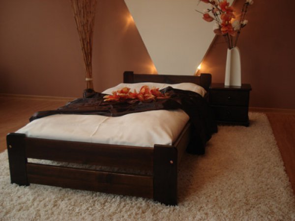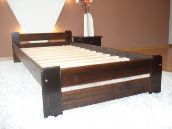 Nová postel z masivu borovice o síle 25 - 28 mm. Postele jsou lakovány dvakrát bezbarvým ekologicky a zdravotně nezávadným lakem. Postele v barevných provedeních olše, dub a ořech, jsou napřed mořeny ve výše zmíněných odstínech a následně dvakrát lakovány průhledným lakem. Barevná provedení naleznete zvlášť.