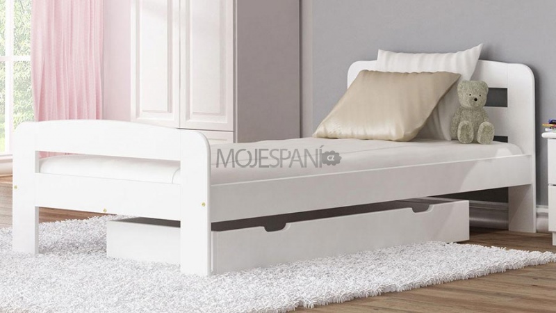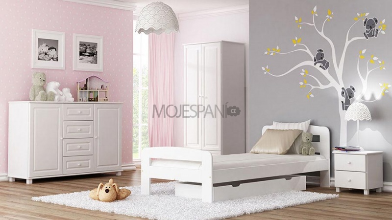 Sbírka bílého nábytku zdůrazňuje exkluzivní charakter interiéru. Tato postel je vyrobena z masivu borovice o síle 25 - 28 mm. Postele jsou lakovány dvakrát ekologicky a zdravotně nezávadným lakem.