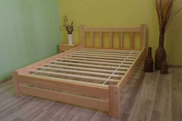 Nová postel z masivu borovice o síle 25 - 28 mm. Postele jsou lakovány dvakrát bezbarvým ekologicky a zdravotně nezávadným lakem. Postele v barevných provedeních olše, dub a ořech, jsou napřed mořeny ve výše zmíněných odstínech a následně dvakrát lakovány průhledným lakem. Barevná provedení naleznete zvlášť.