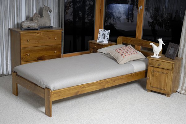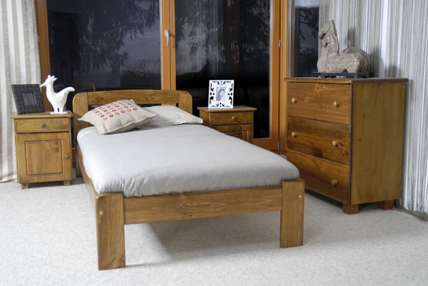 Nová postel z masivu borovice o síle 26 mm. Postele jsou lakovány dvakrát bezbarvým ekologicky a zdravotně nezávadným lakem. Lůžka jsou ručně barvená, broušená a znovu lakovaná, pouze tento postup zaručí požadovaný konečný výsledek . Postel vypadá dokonale a zachovává si svou původní strukturu. Postele v barevných provedeních olše, dub a ořech, jsou napřed mořeny ve výše zmíněných odstínech a následně dvakrát lakovány průhledným lakem.