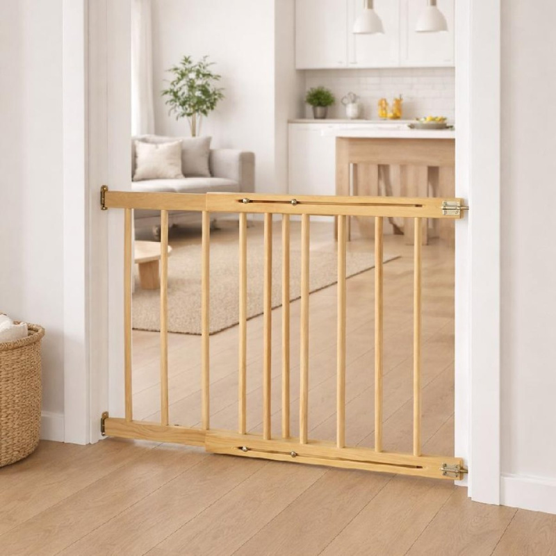 Zabezpečující branka do dveří nebo na schody. Vyrobeno z borovicového dřeva I. jakosti. Otevírání na obě strany. Branku možno namontovat do rámu dveří vruty, do stěny rozporovými kolíky.. Závěsy možno připevnit dvěmi způsoby. 1. branku možno demontovat kdykoliv. 2. branka pevně chycená v závěsech. Nátěr bezbarvým, ekologickým lakem. Tyče o šíři cca 20 mm, mezery mezi tyčemi 7 cm. Plynulá regulace v rozmezí 102 cm - 160 cm. Kvalitní branka za bezkonkurenční cenu.