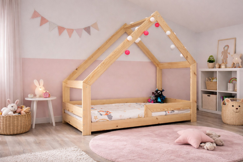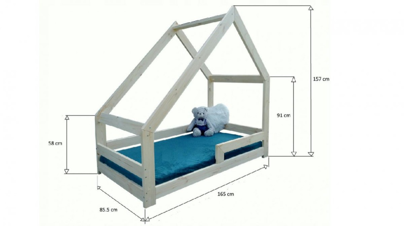 Postel domeček pro větší děti s ochrannou bariérkou, která chrání dítě před pádem. Tato postel je vyrobena z masivního borovicového dřeva. Postel je lakována nezávadným ekologickým lakem, vhodným pro styk s dítětem. Součástí je pevný a stabilní rošt. Snížený práh, umožňuje používat tuto postel i pro nejmenší děti. Nosnost této postele je 80 kg. Síla masivu 2,5 cm. Dekorace nejsou součástí.