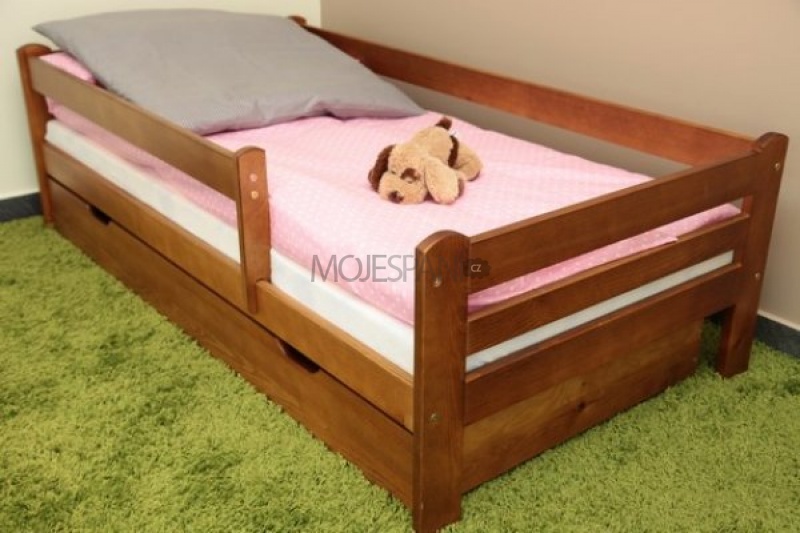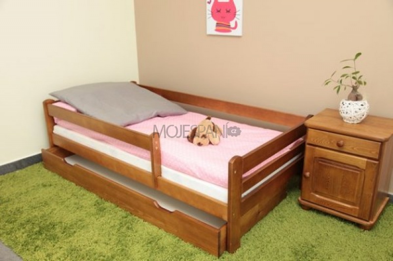 Dětská postel je vyrobena z masivu borovice. Postel nejen pro větší děti s ochrannou bariérkou. Bariérku je možno namontovat jak z levé, tak i z pravé strany. Součástí této postýlky je matrace PUR pěna s potahem. Potah této matrace je snímatelný a pratelný. Postel je vyrobena z masivu borovicového dřeva a součástí je i objedmná zásuvka. Součástí této postýlky jsou z bezpečnostních důvodů zaoblené rohy. Postel je lakována ekologicky nezávadným lakem, vhodným pro styk s dítětem. Snížený práh, umožňuje používat tuto postel i pro nejmenší děti. NOSNOST POSTELE JE 80 KG.